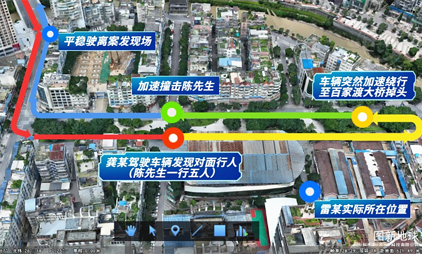 龚某随即驾车折返,行至事发的丁字路口附近时,因夜色昏暗,误将在对向人行横道上行走的陈先生认作雷某,遂猛踩油门,高速径直冲向陈先生……