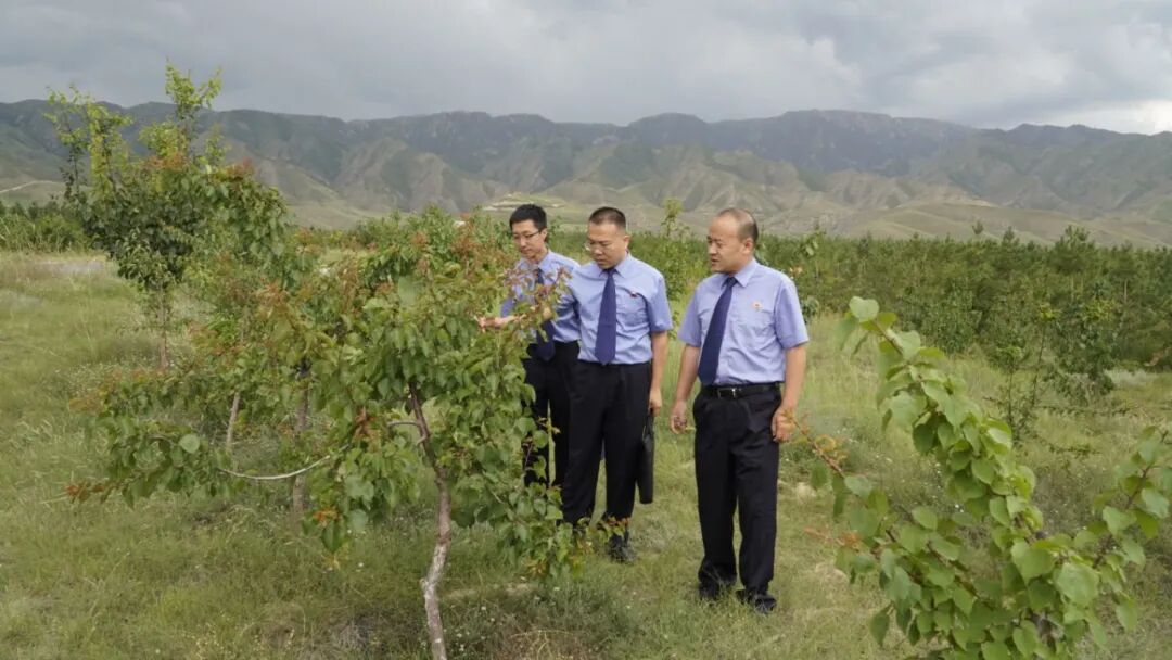 检察干警在“武威检察碳汇司法保护实践基地”查看新种植树木的成活情况。