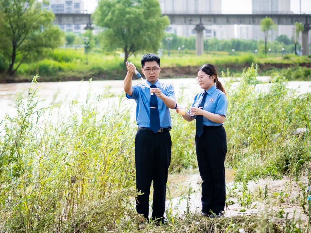 陕西省西安市灞桥区检察院干警对灞河水质进行取样检测。